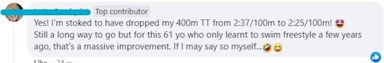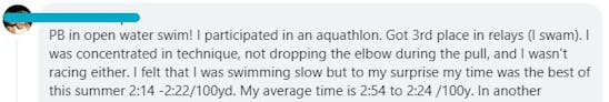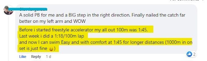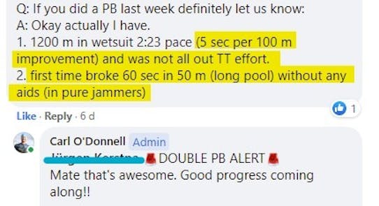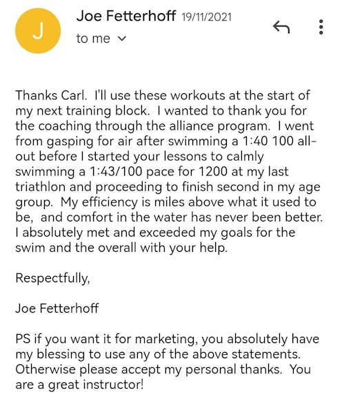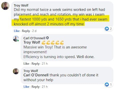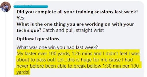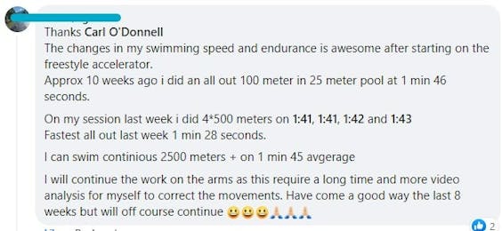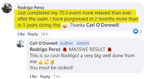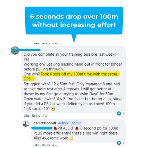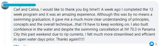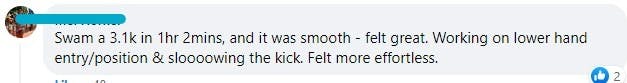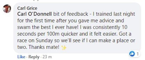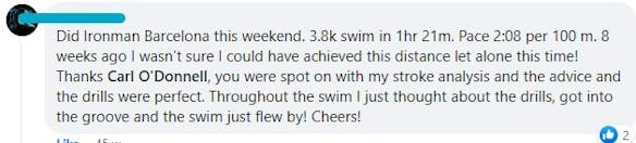 I then signed up for a 12 week program leading up to Dubai 70.3 Ironman . It gave me so much confidence and I incorporated many of the drills in my swimming every week and found I went from 2.10/ 100m to 1.47/100m at my fastest consistently in the pool.Â